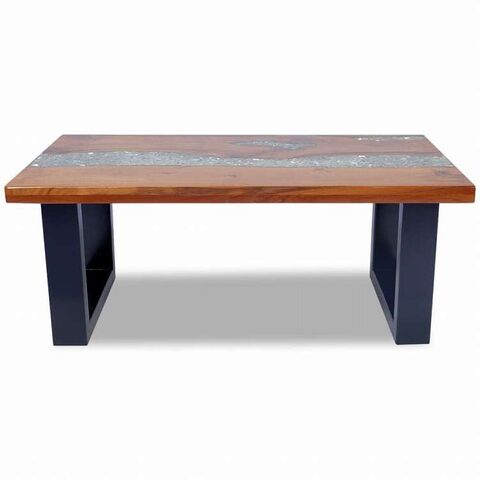 ■チークとマンゴーの無垢材に透明な樹脂の装飾を施したユニークなコーヒーテーブル。素朴な魅力を放ち、注目を集める存在になるでしょう。その長方形のテーブルトップには安定性があり、安全に飲み物や花瓶、フルーツボウル、装飾品などを置くことができます。サイドテーブルとしても活用できます。 テーブルトップは完全に手作りで、職人の技が高級感を与えています。ベースには丈夫なマンゴーウッドを使用し、ブラック塗装で仕上げました。組み立てはとても簡単です。 重要事項:木材は天然素材であるため、色や木目模様は商品ごとに異なり、各テーブルはユニーク。ランダム配送。