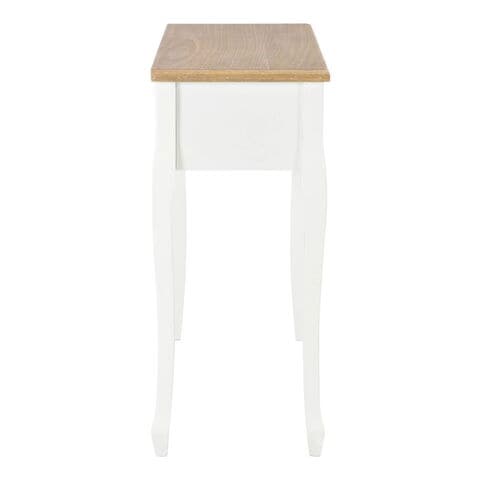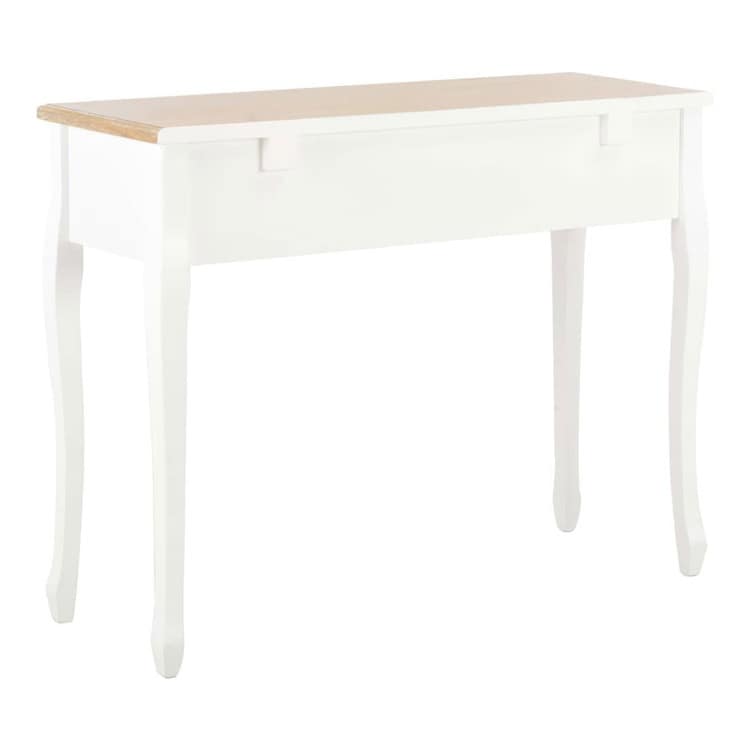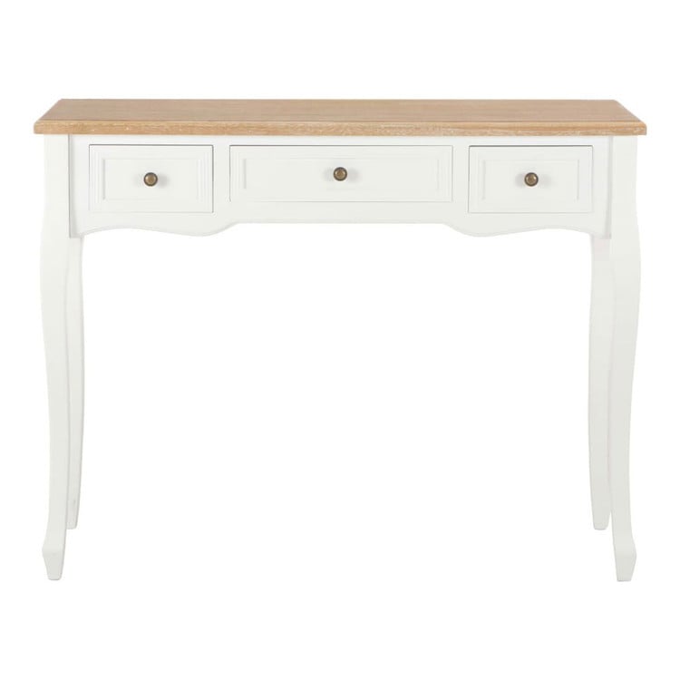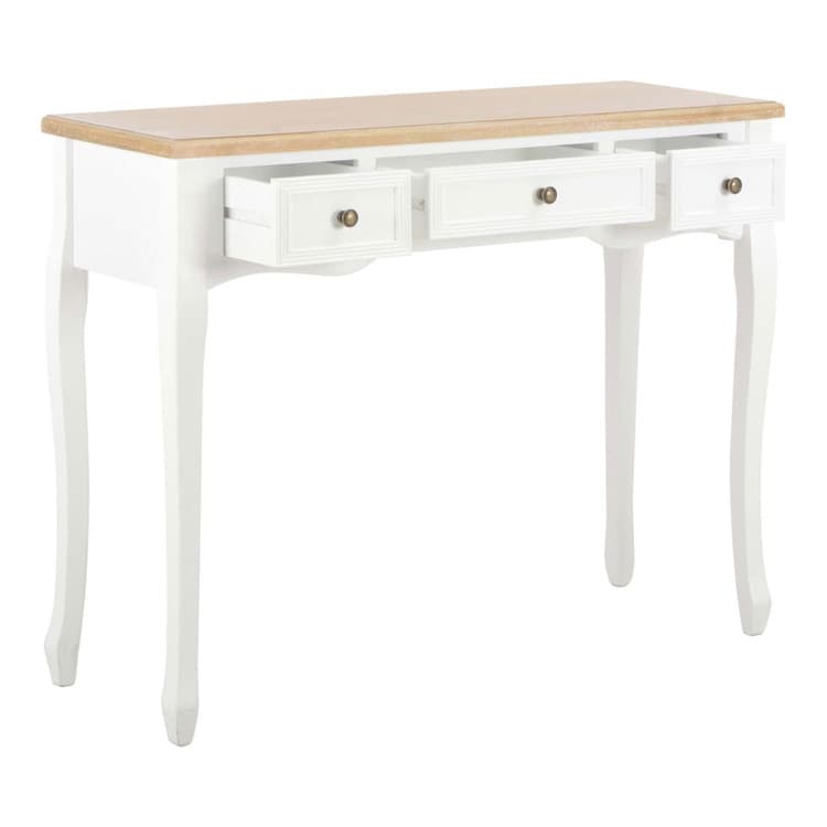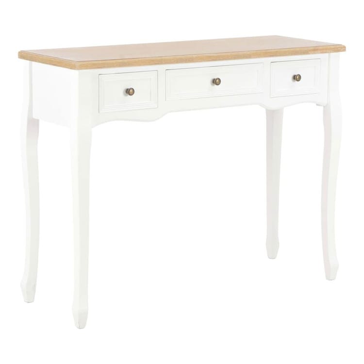 シンプルながら飽きないデザインのコンソールテーブル。リビング、ダイニングルーム、廊下などにぴったり。職人技が光る設計のテーブルは、非常に機能性に優れています。コンパクトデザインは、スペースをほとんどとらず、こぢんまりとしたお部屋や空間にぴったり。滑らかに開く引き出し3段には、小物、化粧品などの小さな持ち物を収納する予備のスペースとして活用できます。このドレッシングテーブルは、高品質のMDFとパイン材でできており、耐久性を高めるためにホワイト塗装仕上げが施されています。長年ご使用できる作りです。