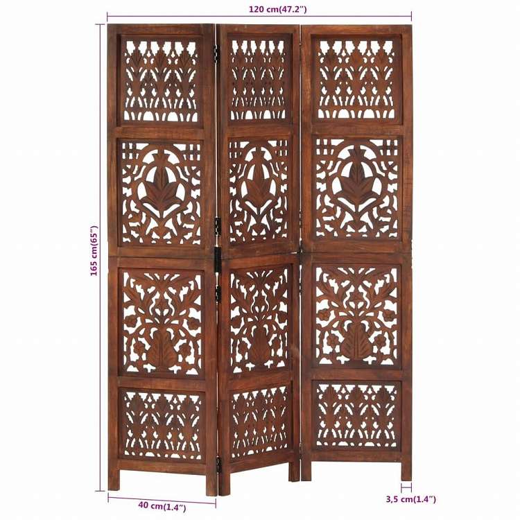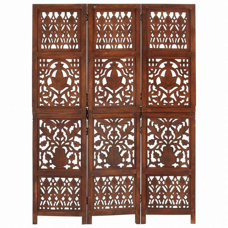 vidaXL 手彫り間仕切り 3枚パネル ブラウン 120x165cm マンゴー無垢材家具 間仕切り
