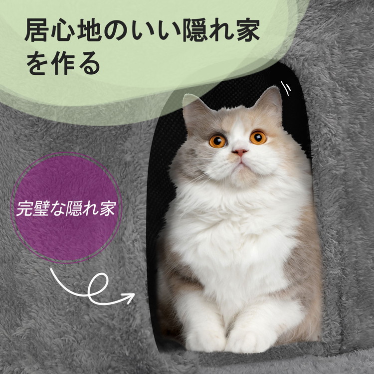 猫用ツリーを引っ掻くことは、愛猫が体をストレッチして運動する、良い機会。特に寒い冬の間、室内に閉じ込められている猫には理想的な運動方法です。サイザル麻ロープで包まれた引っ掻きポールは、爪とぎできる場所として大活躍。これで、猫の「引っ掻きたい」というの本能を、健康的に発揮できます。このプレイセンターに飛び跳ね上がったり、追いかけ合ったりして、思う存分楽しんでいただけます。キャットタワーの天辺にはボールがあり、好奇心満々な猫の興味を引きつけます。十分なプレイタイムを満喫した後は、眺めの良い上部のプラットフォームに座り込んでくつろぐのを、気に入るに違いありません。楽しい機能満載の猫用プレイハウス。愛猫たちのお気に入りのたまり場になること間違いありません。