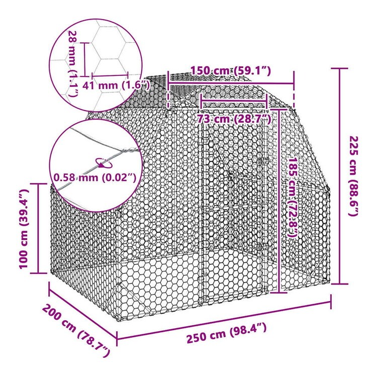 このチキンランを使えば、鶏が走り回るための広いスペースを作ることができます。頑丈な構造:亜鉛メッキされた鉄骨フレームで作られたこの鶏小屋は、長持ちする耐久性と防錆性を保証し、鶏に安全な環境を提供します。メッシュデザイン:六角形のメッシュワイヤーは、適切な換気を可能にしながら、捕食者からの優れた保護を提供し、鶏を安全で快適に保ちます。便利なアクセス:このウォークインチキンランは、ロック可能なドアを備えており、不要な侵入者を防ぎながら、鶏の掃除、給餌、操作が簡単なため、完全な安心感が得られます。多目的な使用:この多目的な鶏舎は、遊ぶ、運動する、訓練する、または単にあなたの鶏を安全に保つなど、複数の目的に役立ちます。鳥、ウサギ、アヒル、ガチョウなど、あなたの動物のための完璧な遊びの楽園になります。