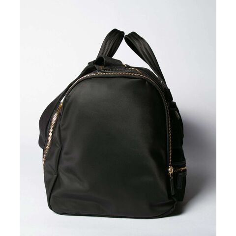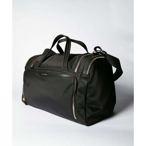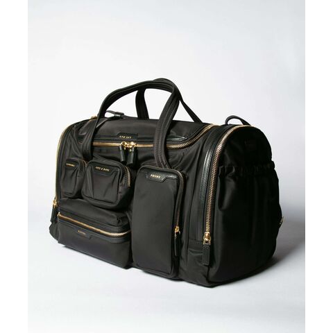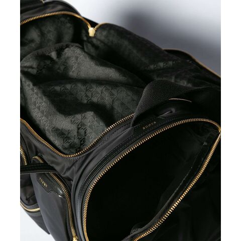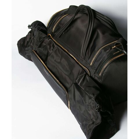 側面に「Shoes」、前面には「Phone」など、内部を含め収めるべきアイテムの刻印を施した多数のポケットのほか、着用後のウェアを収めるランドリー・バッグ、化粧水などを収める透明なポーチが付属します。素材には、再生ナイロンであるECONYLを用いています。