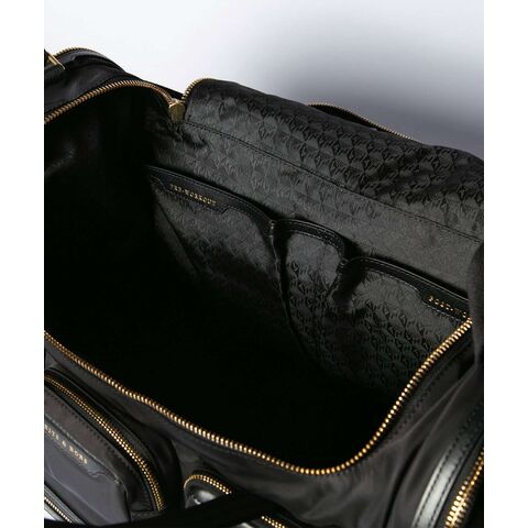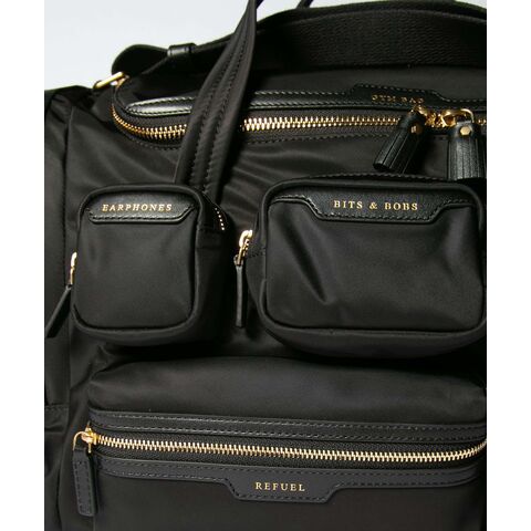 外部様式:前面に「BITS & BOBS」「EARPHONES」「REFUEL」「PHONE」のラベル付きポケット、「LOTIONS & POTIONS」「WATER」「SHOES」のラベル付きサイドポケット、背面に「FLOOR MAT」ラベル付きマット収納スペース