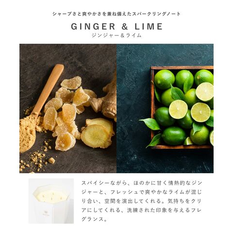 スパイシーながら、ほのかに甘く情熱的なジンジャーと、フレッシュで爽やかなライムが混じり合い、空間を演出しくてれる。気持ちをクリアにしてくれる、洗練された印象を与えるフレグランス。