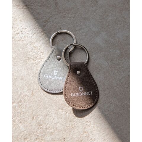 しっかりとした持ち感のあるしずく型のキーホルダー、大き目の二重リング付きで、毎日使う鍵の目印に。プレゼントにも。
