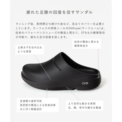 「OOFOS(ウーフォス)」は、2011年にマサチューセッツ州のコハセットでスポーツ選手やトレーナー、大手シューズメーカーの製品開発に携わるベテランチームにより、2 年半の歳月をかけ開発されたリカバリーシューズブランド。製品に使われている特殊素材 OOfoam は、前進力を生む事を目的とした一般的な EVA 素材のミッドソールと異なり、衝撃の反発を 37% 抑えることができ着地による足裏への衝撃を軽減することが可能。それにより膝、腰、背中にかかる負担を軽減し、また人間工学に基づいて設計されたフットベットにより足を優しく包み込み、土踏まずをしっかりサポートします。