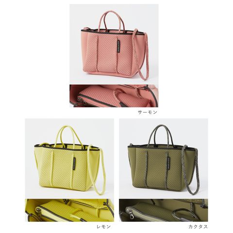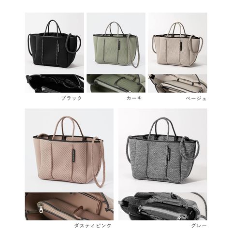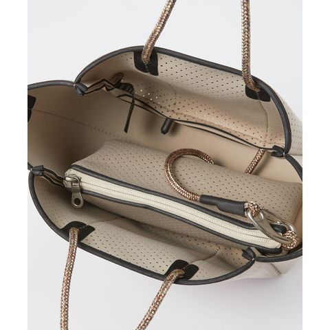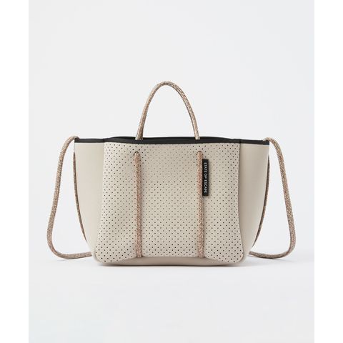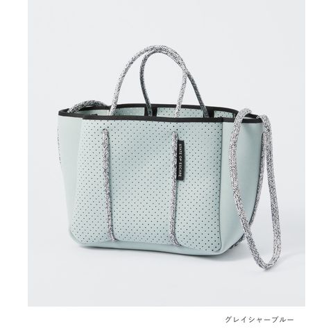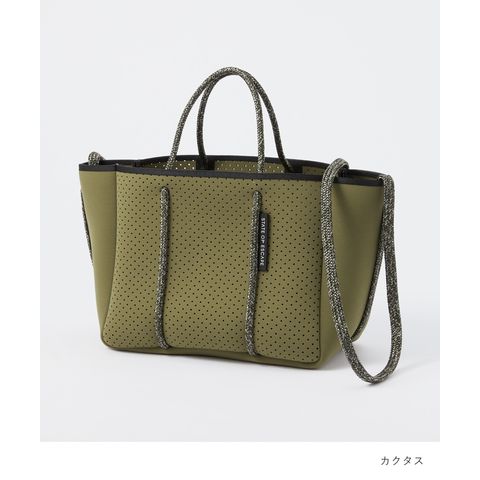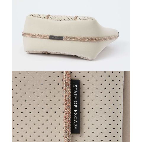 エスケープコレクションの中で小ぶりなトートバッグ、プチオッデセイ。ウエットスーツに採用されるネオプレーンを用い、ショルダーとハンドル部分はヨット等で採用されるセーリングロープを使い、タフな仕様なのに優しい雰囲気なのはステートオブエスケープならでは。ちょっとしたお出かけにぴったりなサイズ。