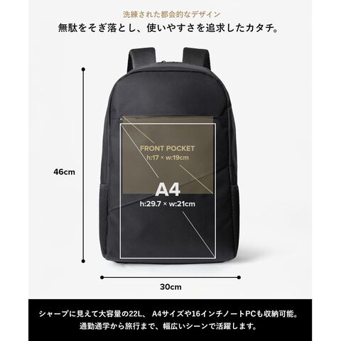 大容量22L:A4サイズや16インチノートPCも収納可能。通勤通学から旅行まで、幅広いシーンで活躍。