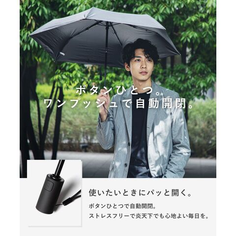 【自動開閉 × 安全ストッパー構造】ワンタッチボタンで片手でも簡単に開閉できる自動開閉式。急な雨でもすぐに対応できます。収納時に手を挟まない安全装置付き設計で、どなたでも安心してお使いいただけます。