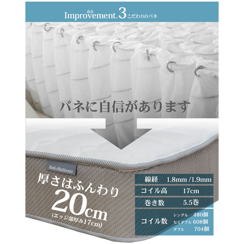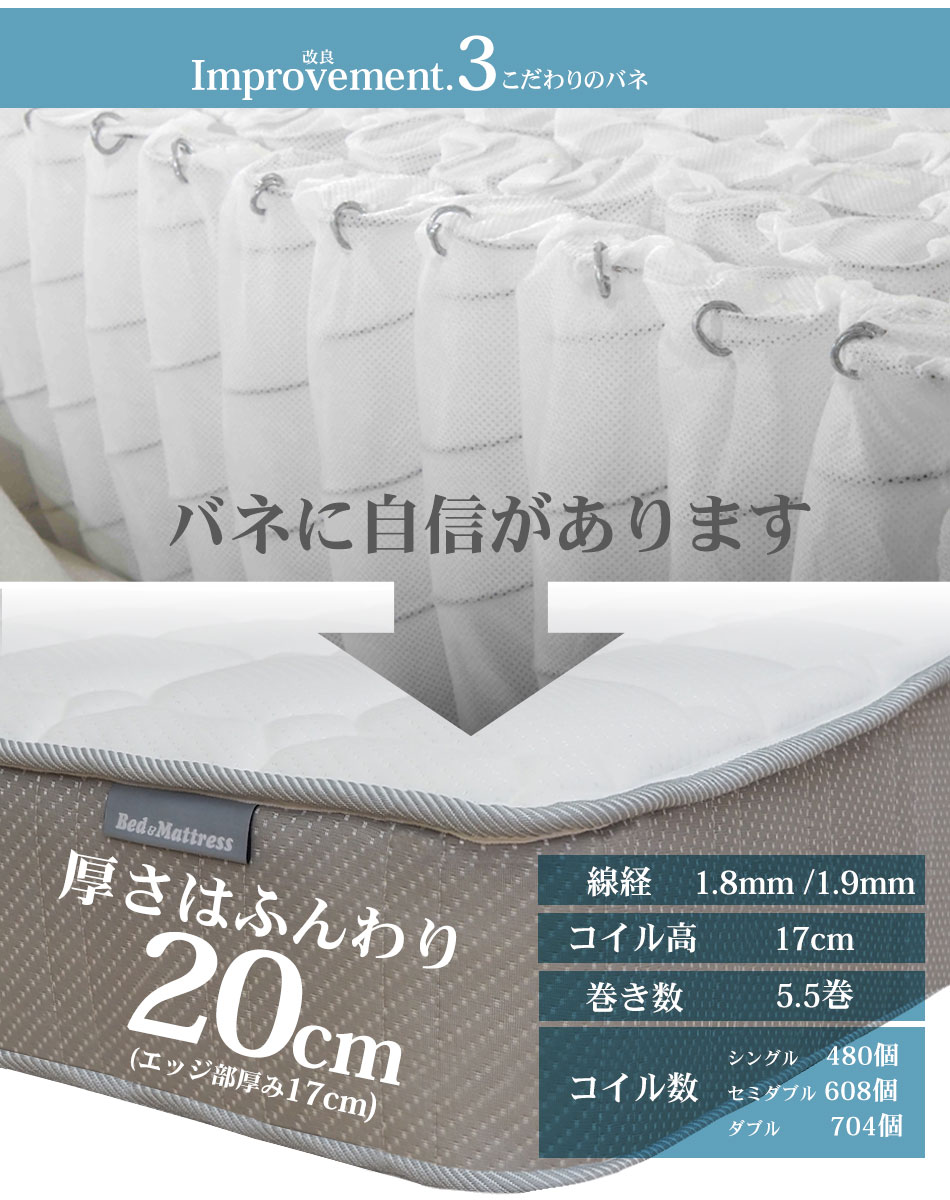 セミダブル:線径1.8mm/1.9mm ポケットコイル 608個 5.5巻
