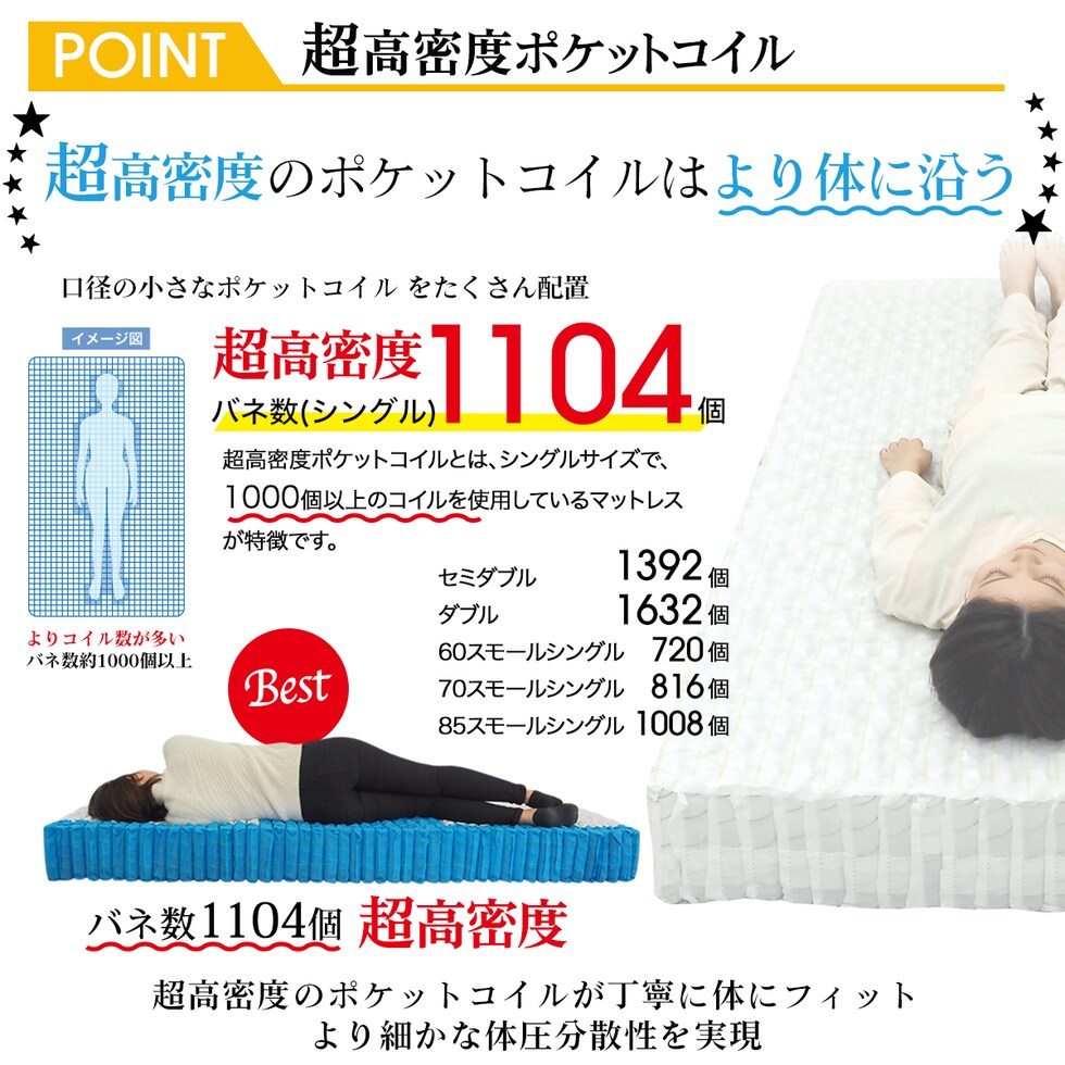 ポケットコイル 超高密度 硬さが選べる マットレス 60スモールシングル セミシングル 両面仕様 ST235P ハード エッジサポート しっかり 厚さ21cm 通気性 スプリングマットレス