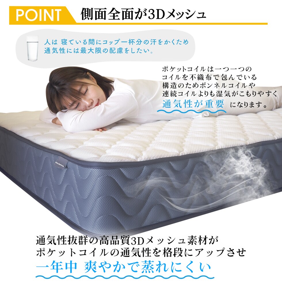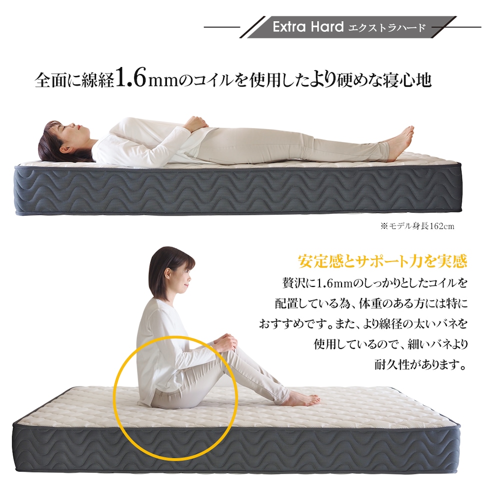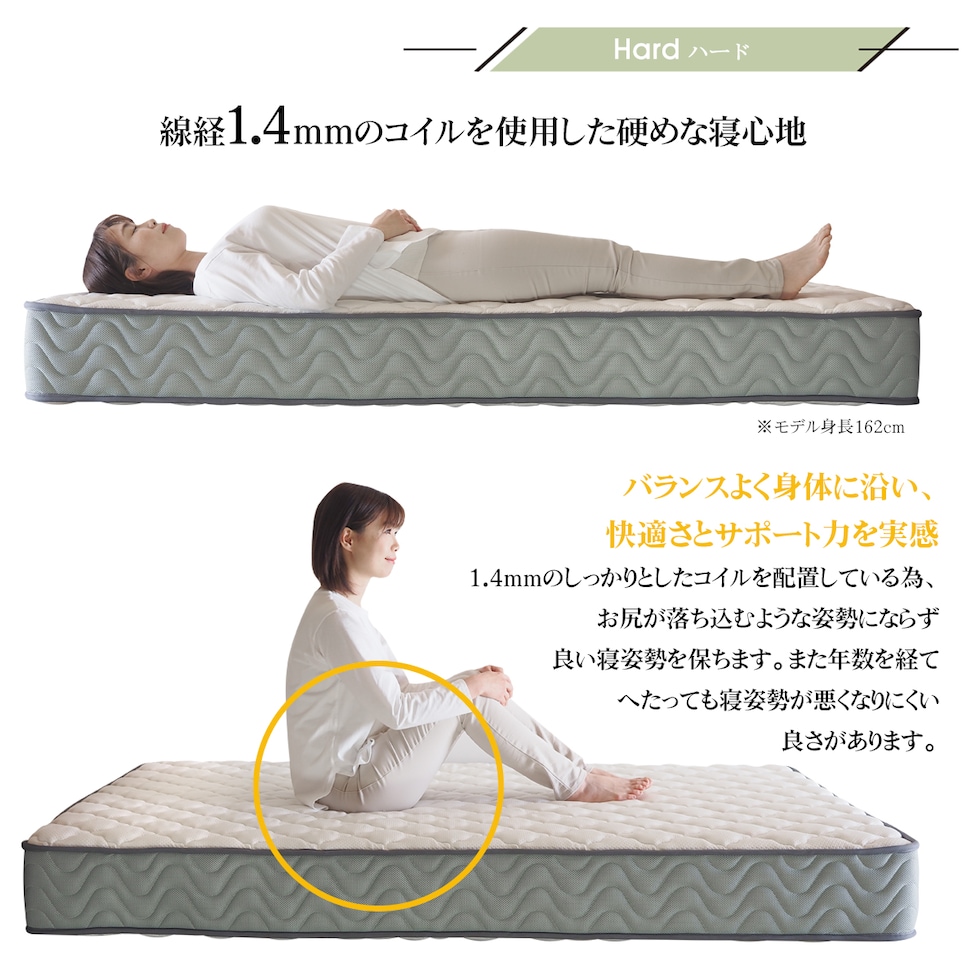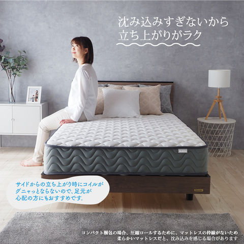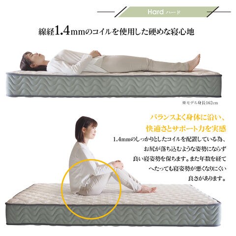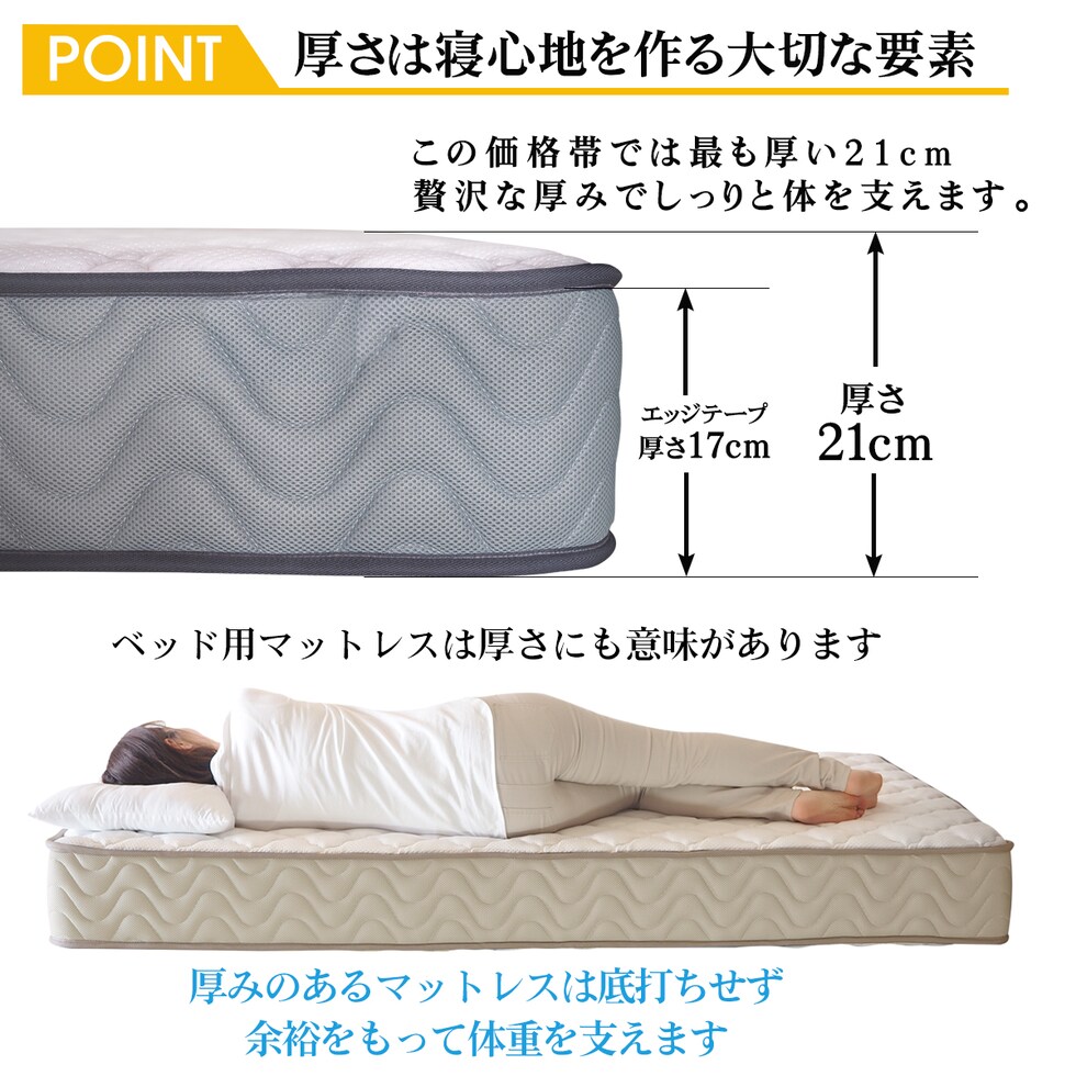 ■厚さ21cmのこのマットレスは、両面仕様で長期間の使用にも耐える設計。エッジサポート(レギュラー、ハード)がしっかりしているため、ベッドからの起き上がりもスムーズです。また、通気性が良いため、湿気がこもりにくく、清潔な睡眠環境を保ちます。さらに気持ち良いニット生地を使用しており、肌触りも抜群です。