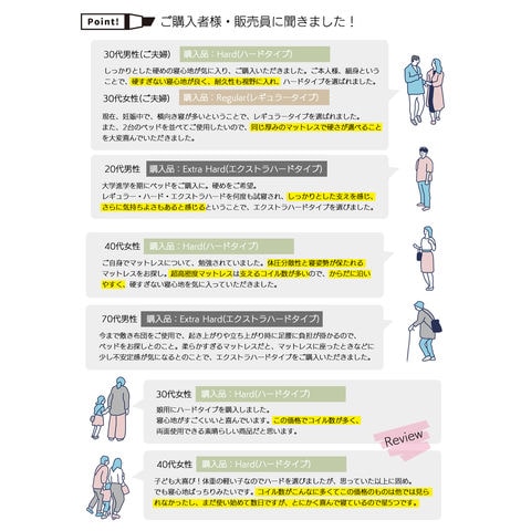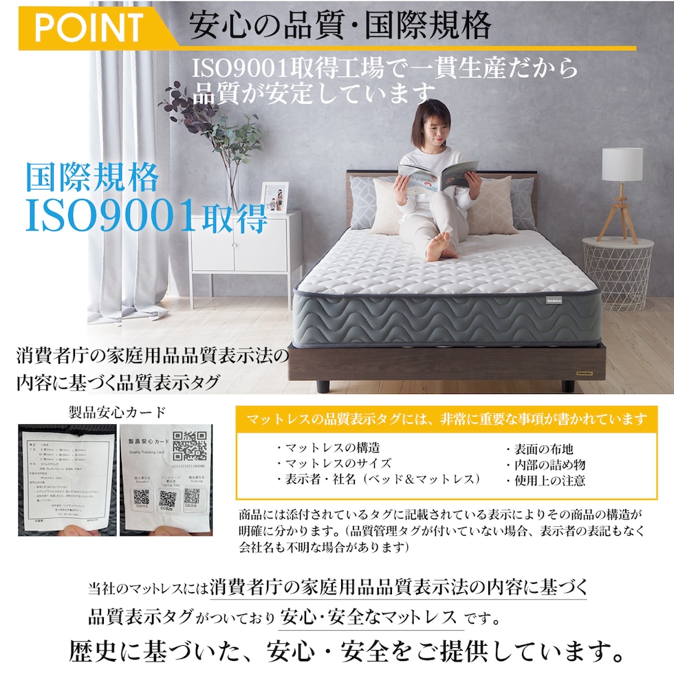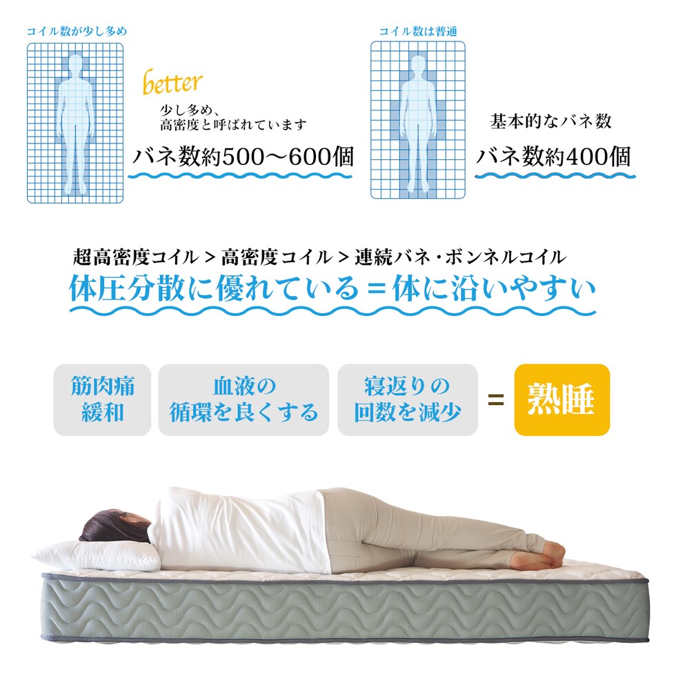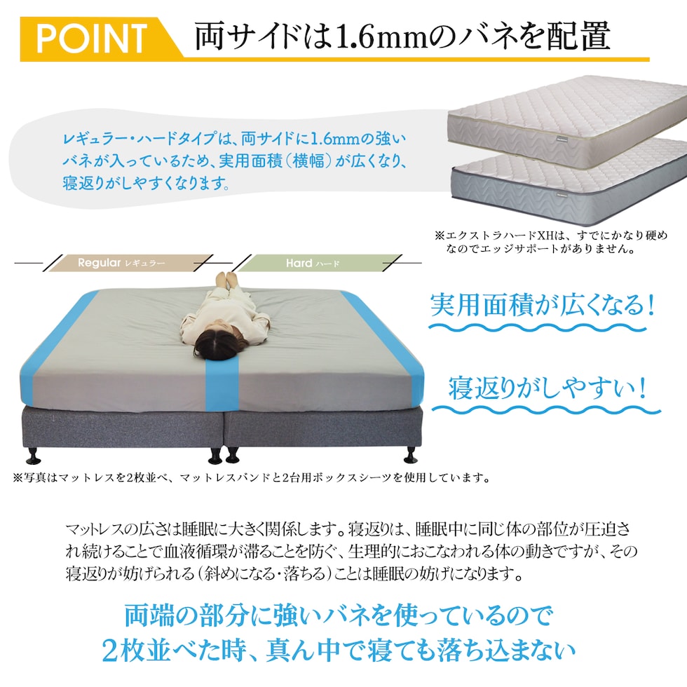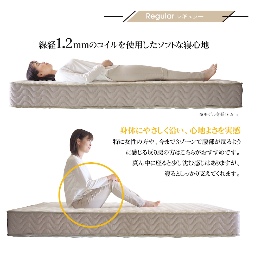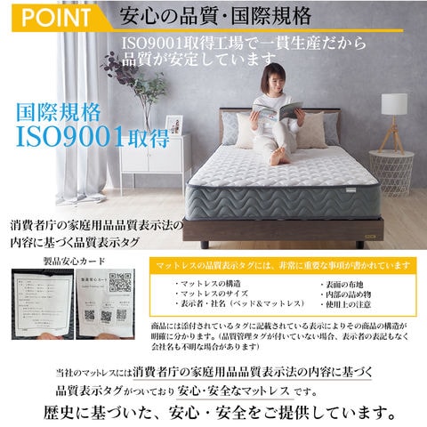 ■厚さ21cmのこのマットレスは、両面仕様で長期間の使用にも耐える設計。エッジサポート(レギュラー、ハード)がしっかりしているため、ベッドからの起き上がりもスムーズです。また、通気性が良いため、湿気がこもりにくく、清潔な睡眠環境を保ちます。さらに気持ち良いニット生地を使用しており、肌触りも抜群です。