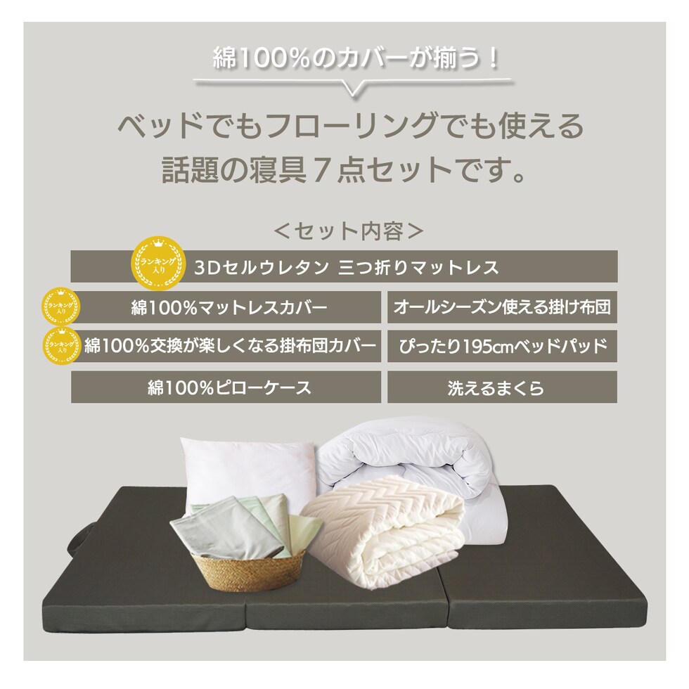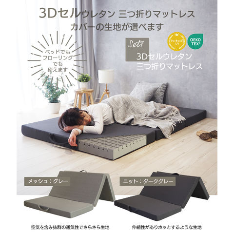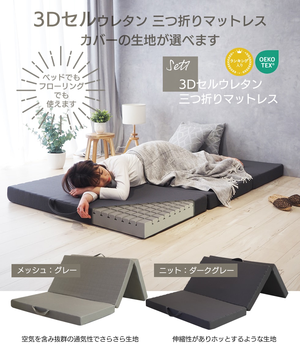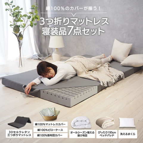三つ折りマットレス 寝装品7点セット シングルサイズ 薄型 ベッドでもフローリングでも使える メッシュカバー付きマットレスとグレー色ベッドカバーセット マットレスカバー 掛け布団カバー ピローケース ベッドパッド 掛け布団 まくら