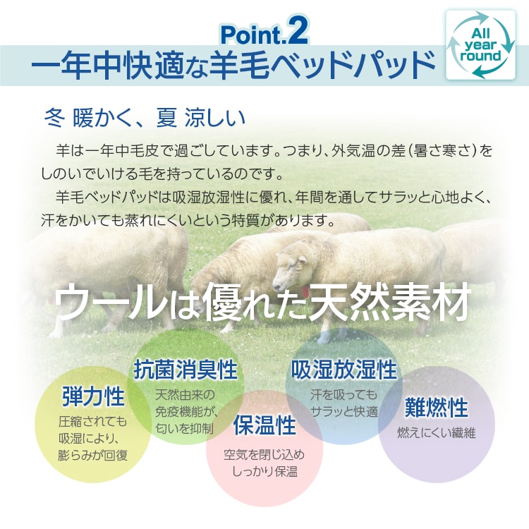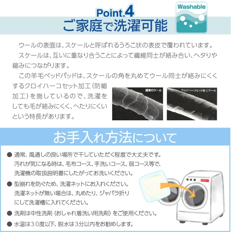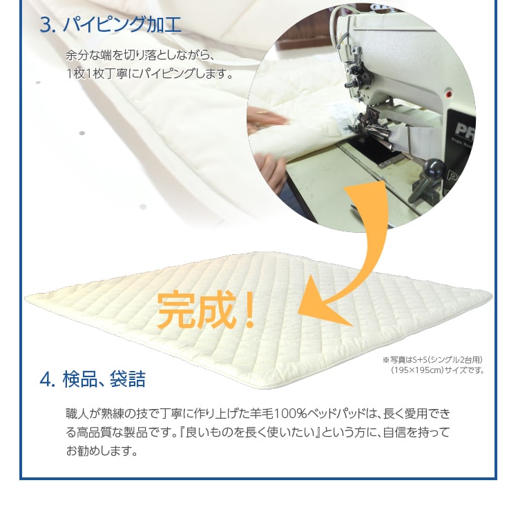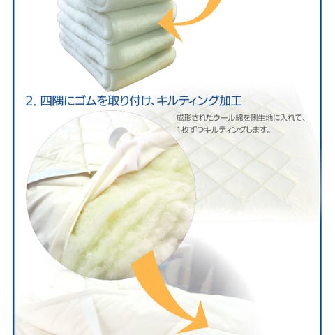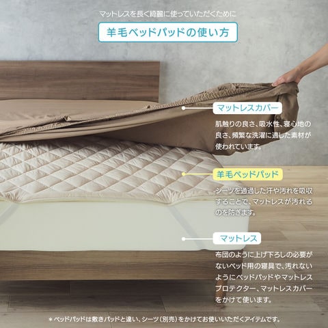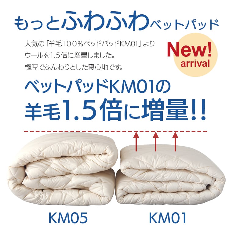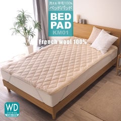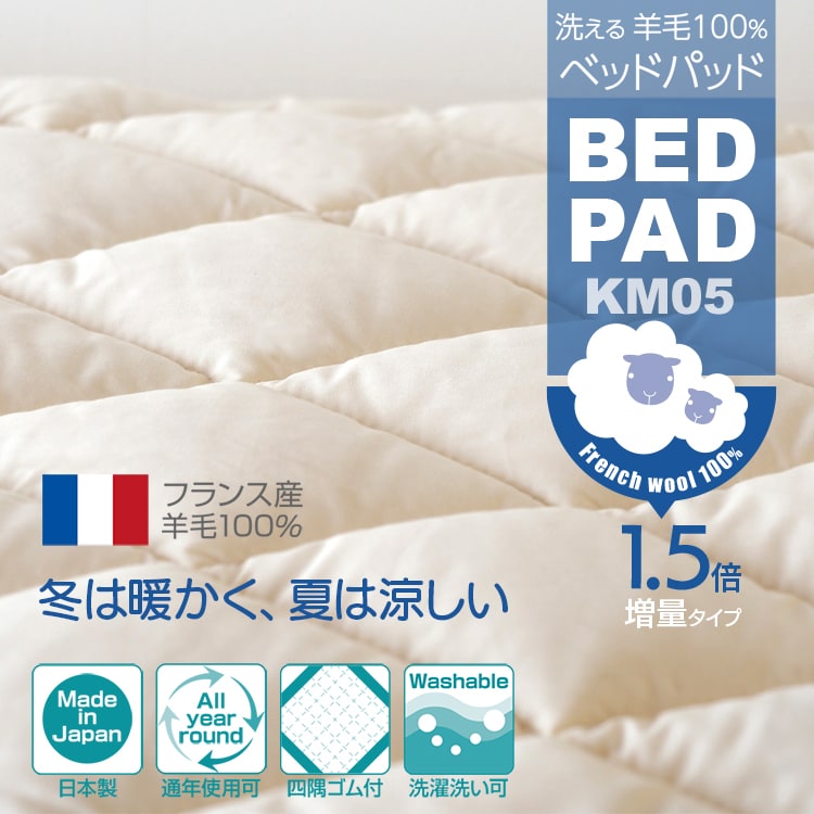 洗える羊毛100% ベッドパッド KM05 1.5倍増量タイプ シングル・セミダブル・ダブル・クイーン・キング・2台用サイズ・セミシングル 日本製 ぴったり オールシーズン 四隅ゴム 丸洗い 長さ195cm 寝心地 ベッド ピッタリサイズ キナリ