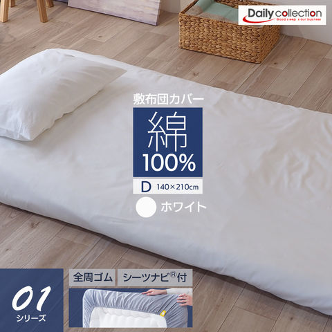 敷布団カバー 綿100% ワンタッチシーツ ダブル (140×210cm) ホワイト フィットシーツ 全周ゴム G01