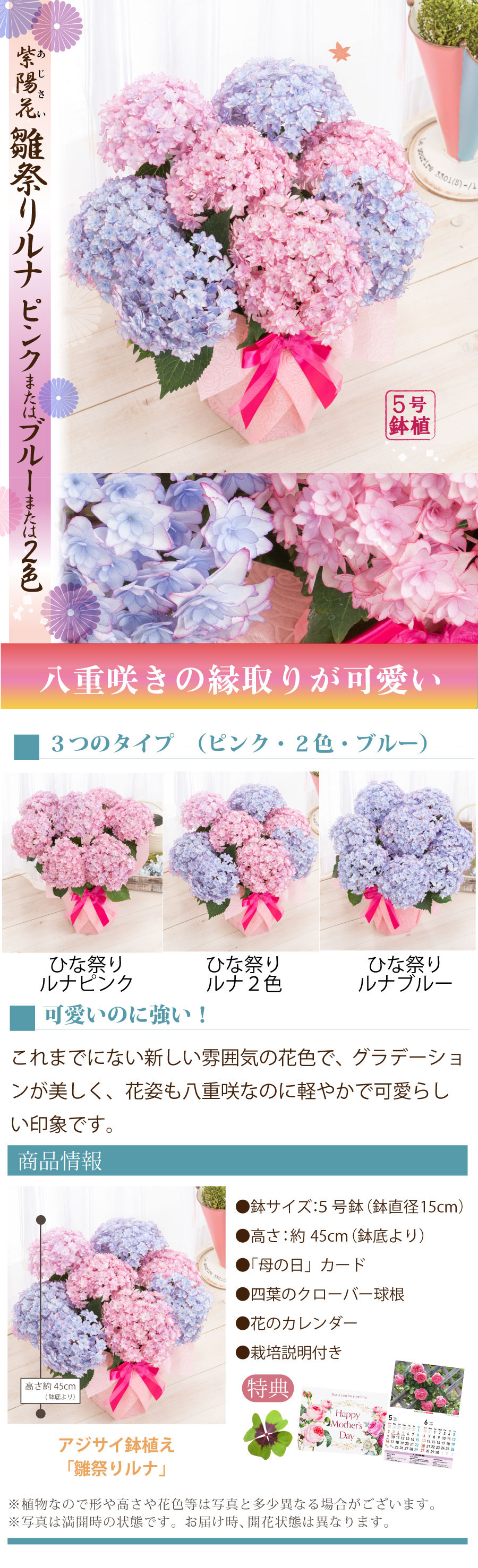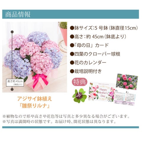 母の日に合わせてお届けする、季節限定のアジサイ鉢植えです。