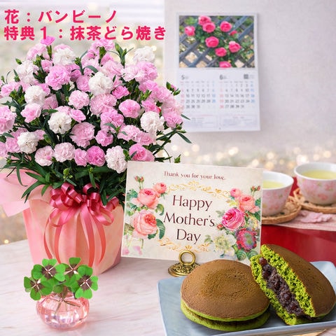 母の日 早割 プレゼント 2026 花とセット ギフト カーネーション バンビーノ 鉢植え 選べる特典付き 抹茶どら焼き 四葉のクローバー球根 カレンダー付き 園芸専門店 吉本花城園
