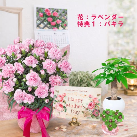 母の日 早割 プレゼント 2026 花とセット ギフト カーネーション ラベンダー 鉢植え 選べる特典付き パキラ 四葉のクローバー球根 カレンダー付き 園芸専門店 吉本花城園