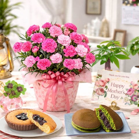 母の日 早割 プレゼント 2026 花とセット ギフト カーネーション さくらもなか 鉢植え 選べる特典付き パキラ 四葉のクローバー球根 カレンダー付き 園芸専門店 吉本花城園