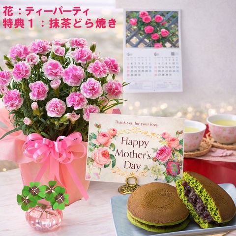 母の日 早割 プレゼント 2026 花とセット ギフト カーネーション ティーパーティー 鉢植え 選べる特典付き 抹茶どら焼き 四葉のクローバー球根 カレンダー付き 園芸専門店 吉本花城園