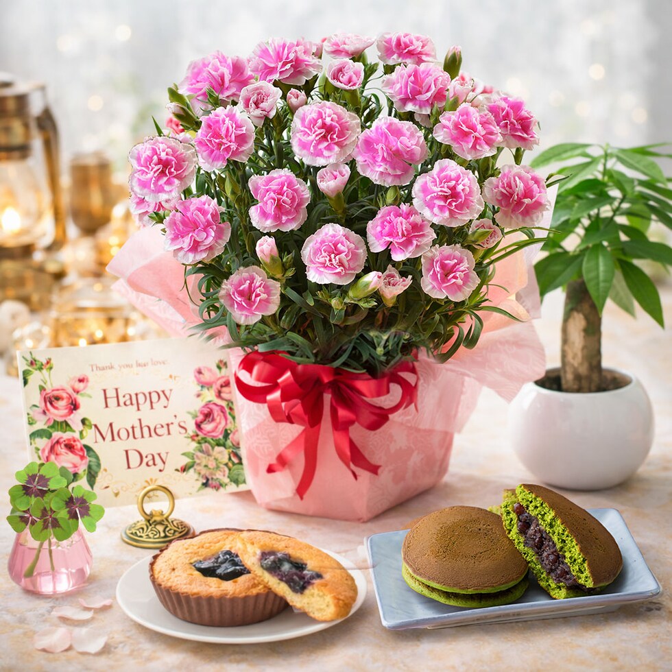 母の日 早割 プレゼント 2026 花とセット ギフト カーネーション ティーパーティー 鉢植え 選べる特典付き ブルーベリーマドレーヌ 四葉のクローバー球根 カレンダー付き 園芸専門店 吉本花城園