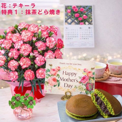 母の日 早割 プレゼント 2026 花とセット ギフト カーネーション テキーラ鉢植え 選べる特典付き 抹茶どら焼き 四葉のクローバー球根 カレンダー付き 園芸専門店 吉本花城園