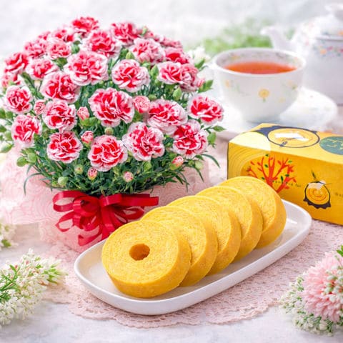 鮮やかに咲くカーネーションの鉢植えに、プレミアムなお菓子を組み合わせた、華やかで気持ちの伝わるセット。