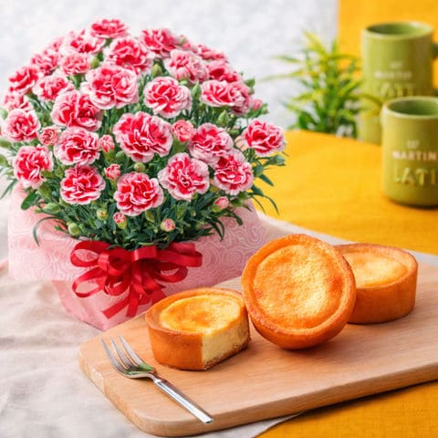 鮮やかに咲くカーネーションの鉢植えに、プレミアムなお菓子を組み合わせた、華やかで気持ちの伝わるセット。