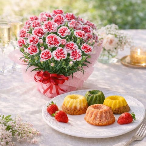 鮮やかに咲くカーネーションの鉢植えに、プレミアムなお菓子を組み合わせた、華やかで気持ちの伝わるセット。