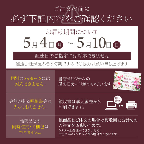5月4日から5月10日の母の日マザーウィーク期間中にお届けいたします。