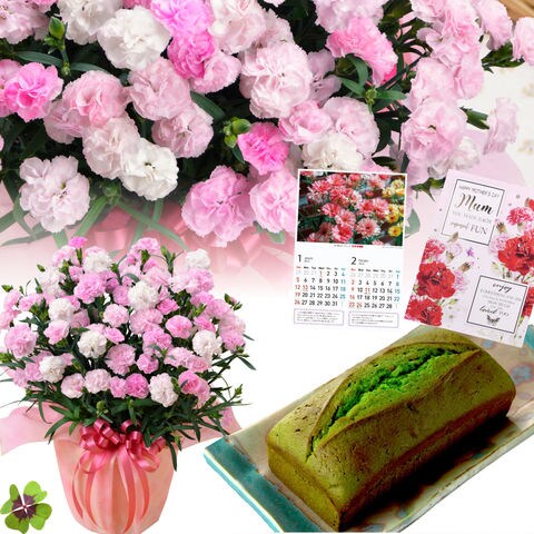 母の日 プレゼント カーネーションとスイーツのセット 【バンビーノと抹茶チーズケーキ】 5号鉢植え 2025 花 ギフト ラッピング 吉本花城園