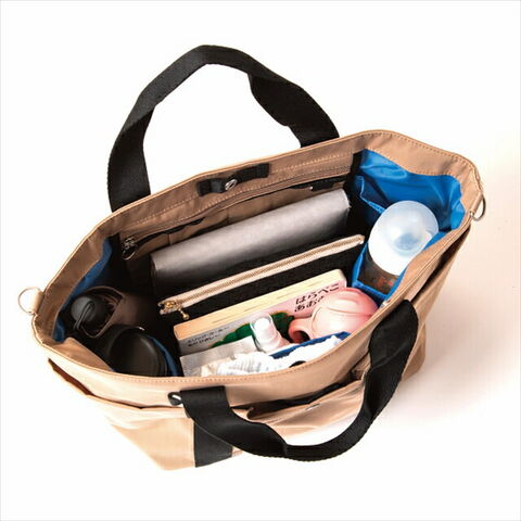 | 小物の収納に便利なポケットや、哺乳瓶・ペットボトルを収納できるボトルホルダー等を配したトートバッグ。マザーズバッグとして、また日常使いも可能なシンプルデザイン。手持ちとショルダーの2WAY仕様です。 |