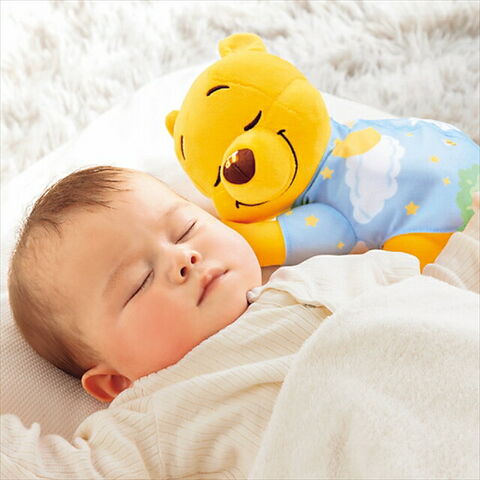 | 赤ちゃんの心拍数に合わせた曲で心地よい眠りに誘う「ぐっすりメロディ」と、ぐずり泣きに効果があると言われる「胎内音」が入った、くまのプーさんのぬいぐるみ。(※ぐっすりメロディとは、日本音響研究所と共同開発の寝かしつけのために開発されたオリジナル音楽。)胎内音などのやすらぐ環境音が2種類・ぐっすりメロディや子守歌、童謡など6曲収録。ぬいぐるみは手洗い可能。 |