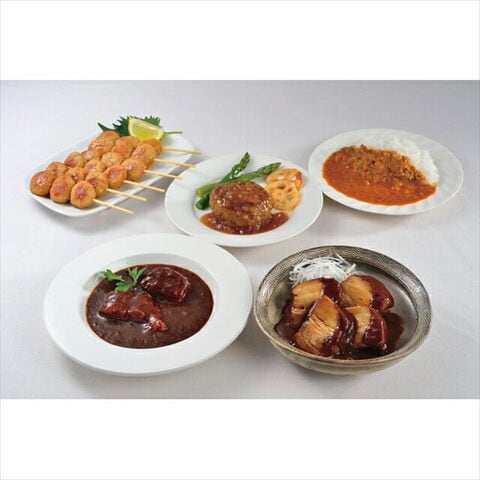 | ハンバーグ(牛肉・豚肉使用)130g×2、和風シャリアピンソース40g×2、赤ワイン&地ビール仕込みのビーフシチュー170g×2、つくね串(6本)210g×1、六穀豚使用お肉屋さんのキーマカリー150g×2、豚肉の味噌煮込み210g×1 |