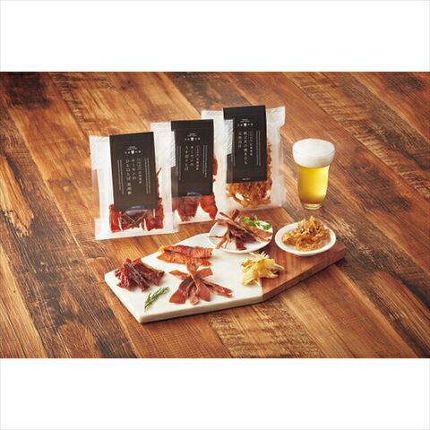 | やわらかあたりめ22g、サーモンの薄切りとば30g、手焼きつまみ鱈30g、いかオリーブオイル&ガーリック22g、サーモンのひと口とば黒胡椒33g、帆立貝の焼きひも40g |