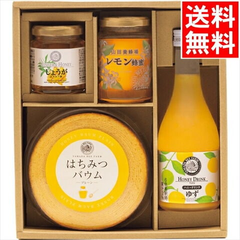 はちみつバウム(直径約13cm)、レモン蜂蜜200g、ゆずハニードリンク300ml、しょうがはちみつ漬120g