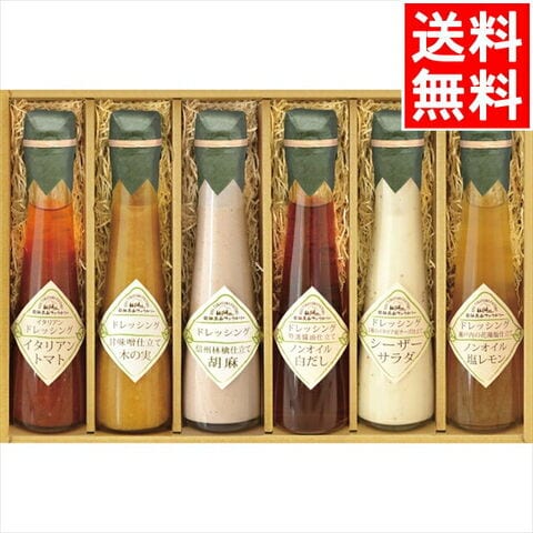 ドレッシング(信州林檎仕立て胡麻・甘味噌仕立て木の実・2種のイタリア産チーズ仕立てシーザーサラダ・イタリアントマトのイタリアン)各120ml×各1、ドレッシングタイプ調味料(特選醤油仕立てノンオイル白だし・瀬戸内の花藻塩仕立てノンオイル塩レモン)各120ml×各1