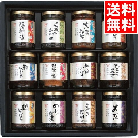 | 福神漬90g・くきわかめ75g・大葉みそ100g・鯛みそ100g・鰹ひじき40g・鮭茶漬60g・牛肉ごぼう55g・たらこ昆布50g・鶏そぼろ50g・のり佃煮95g・えのきだけ90g・黒豆100g |