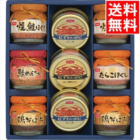 缶詰 瓶詰 ギフト 送料無料 ニッスイ 瓶詰・かに缶詰ギフトセット(BK-50C)【お歳暮 内祝い お返し 御返し 瓶詰め 缶詰め 詰め合わせ 詰合せ おかず ご飯のお供 カニ 蟹 ずわいがに ほぐし身 鮭 鮭めんたい たらこ バラエティ 】