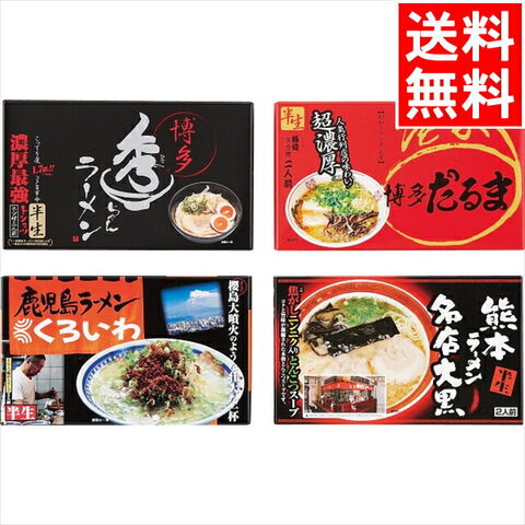 | ラーメン博多だるま(麺100g×2・豚骨スープ68g×2)、博多ラーメン秀ちゃん(麺100g×2・豚骨スープ90g×2)、熊本ラーメン名店大黒(麺100g×2・焦がしニンニク入豚骨スープ54g×2)、鹿児島ラーメンくろいわ(麺100g×2・豚骨スープ54g×2)(全て生麺) |
