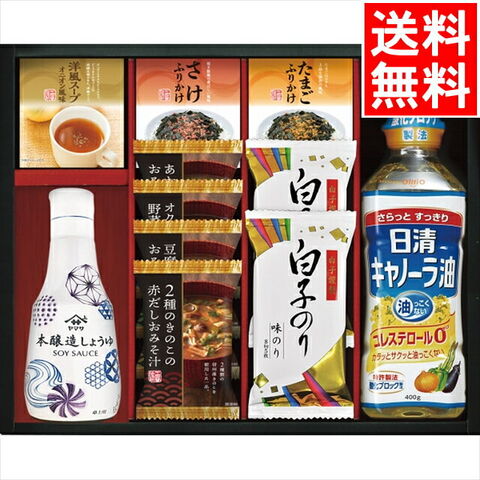 とうふと油揚げのおみそ汁×1、2種のきのこの赤だしおみそ汁×1、あおさとわかめのおみそ汁×1、オクラ入ねばねば野菜スープ×1、ヤマサ鮮度しょうゆ200ml×1、丸美屋たまごふりかけ(2.5g×3)×1、丸美屋さけふりかけ(2.5g×3)×1、丸美屋洋風スープオニオン風味(粉末)(2.5g×3)×1、白子のり味のり(8切5枚)×2、日清キャノーラ油400g×1