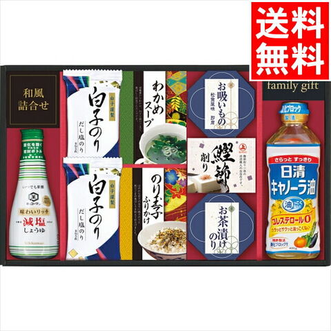 | 白子だし塩のり(8切5枚)×2・わかめスープ(5.3g×2・粉末)・のり玉子ふりかけ(4.5g×2)・永谷園お吸いもの松茸風味(2.3g×2・粉末)・永谷園お茶漬けのり(4.7g×2)・鰹節削り(1.5g×2)・キッコーマン減塩しょうゆ200ml・日清キャノーラ油400g×各1 |