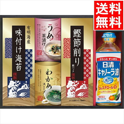 | 有明海産味付け海苔(3切6枚)・鰹節削り(2g×4)・うめ茶漬け(4.3g×2)・わかめスープ(5.3g×2・粉末)・日清キャノーラ油400g×各1 |