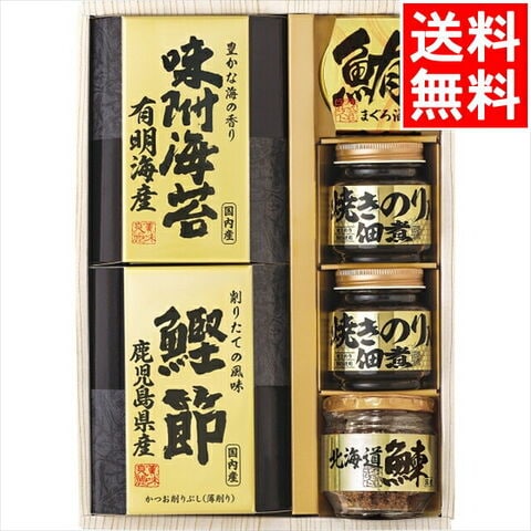 | 北海道産鰊フレーク50g×1、焼きのり入佃煮85g×2、鹿児島県産鰹節(2g×3)×1、有明海産味附海苔(8切10枚入)×1、まぐろ油漬け70g×1 |