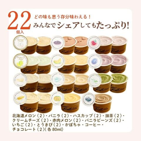 | ・22個セット:北海道メロン(2)・バニラ(2)・ハスカップ(2)・クリームチーズ(2)・赤肉メロン(2)・コーヒー・バニラビーンズ(2)・いちご(2)・かぼちゃ・抹茶(2)・とうきび(2)・チョコレート(2)(各80ml) |