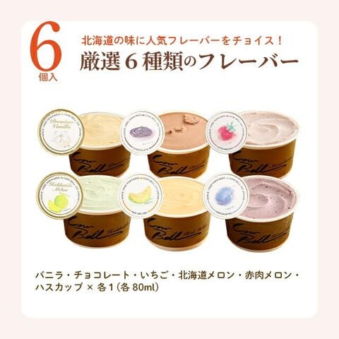 | ・6個セット:バニラ・チョコレート・いちご・北海道メロン・赤肉メロン・ハスカップ×各1(各80ml) |