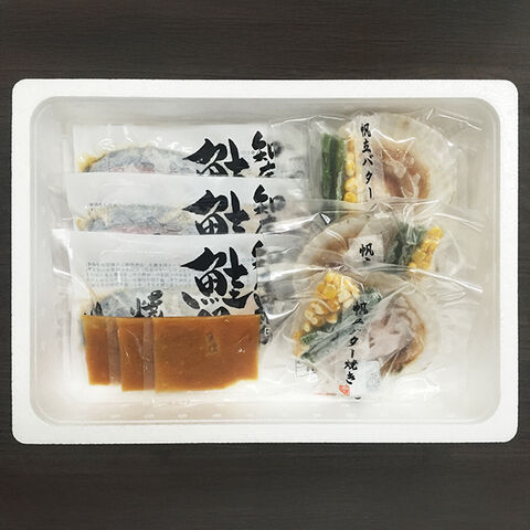 | ちゃんちゃん焼き用秋鮭味噌漬切身80g×3枚、添付味噌たれ30g×3袋、帆立バター焼きセット(帆立片貝1枚(北海道産)、アスパラガス10g、コーン10g、バター1個入)×3 |