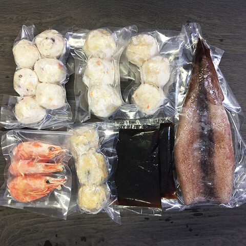 | かに入つみれ×3個、えび入つみれ×3個、とりごぼうつみれ×3個、たこ入つみれ×6個、ボイル海老×3尾、ツボ抜きいか100g×1尾、たれ(濃縮:醤油仕立て)50ml×2袋 |