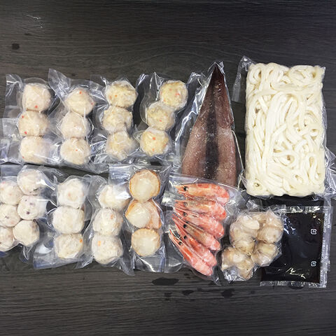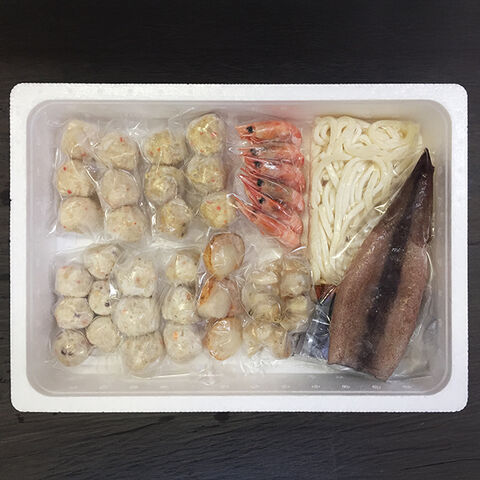 | かに入つみれ×6個、えび入つみれ×6個、とりごぼうつみれ×6個、たこ入つみれ×6個、ボイル海老×6尾、ボイル帆立×3個、ボイルつぶ60g×1袋、ツボ抜きいか100g×1尾、冷凍うどん250g×1玉、たれ(濃縮:醤油仕立て)50ml×2袋 |